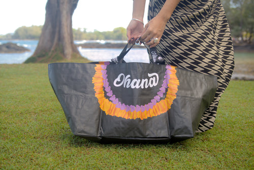 Each bag features meaningful design elements — ʻilima and pikake leis, playful ʻukulele motifs, and classic lauhala patterns — celebrating our heritage while keeping our aloha for ʻohana close, wherever life takes you.